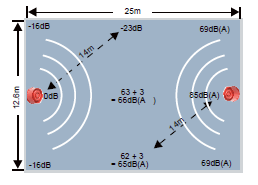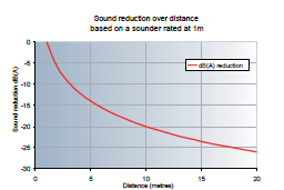 In open space, as the distance from a sounder doubles, the sound level will be reduced by 6dB(A), as shown.